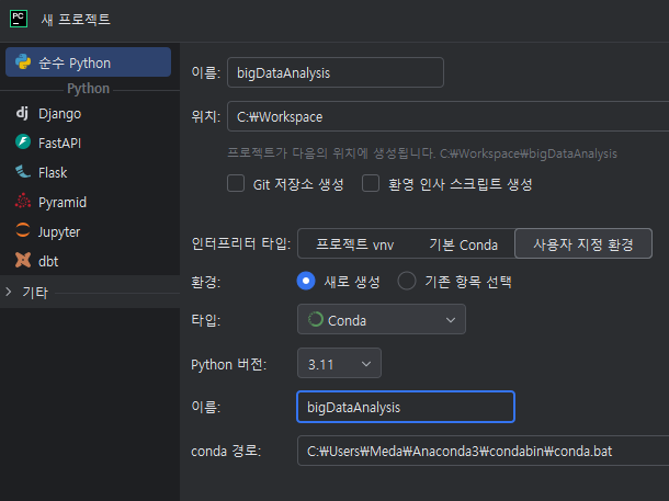 파이참에서 conda환경을 새로 생성하여 프로젝트를 생성한다.