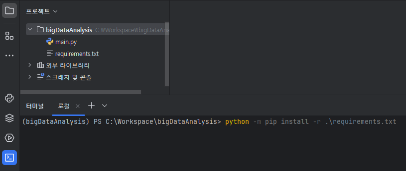 requirements.txt 파일을 프로젝트 경로에 복사하여 옮긴 뒤, 파이참에서 좌측 하단 파란색 터미널 아이콘을 클릭하고