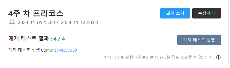 디스코드를 보니 로컬에선 되는데 3/4에서 테스트가 안넘어갔다는분들이 많이 보였지만 나는 문제없이 한번에 넘어갔다... 마지막 주차까지 한방에 다 돌아가서 다행이다... (실제 채점은 얼마나 틀렸을지 미지수지만 말이지)